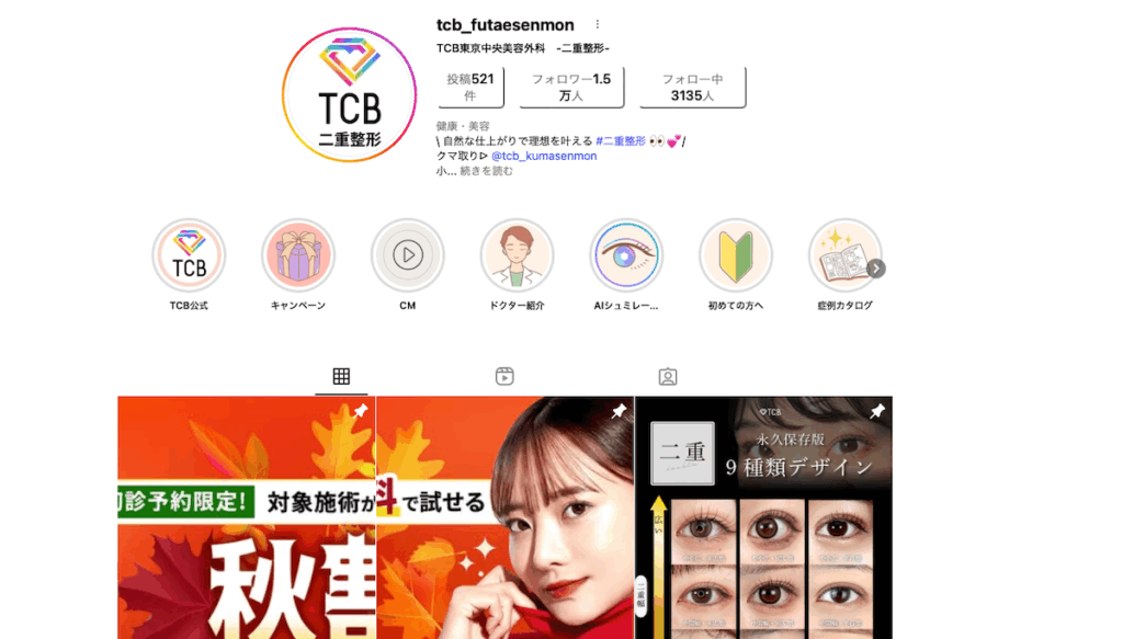 また、プロフィールではハイライトを活用してにはその月のキャンペーやドクター紹介、AIシミュレーションの案内などがまとめられているのも成功要因といえるでしょう。