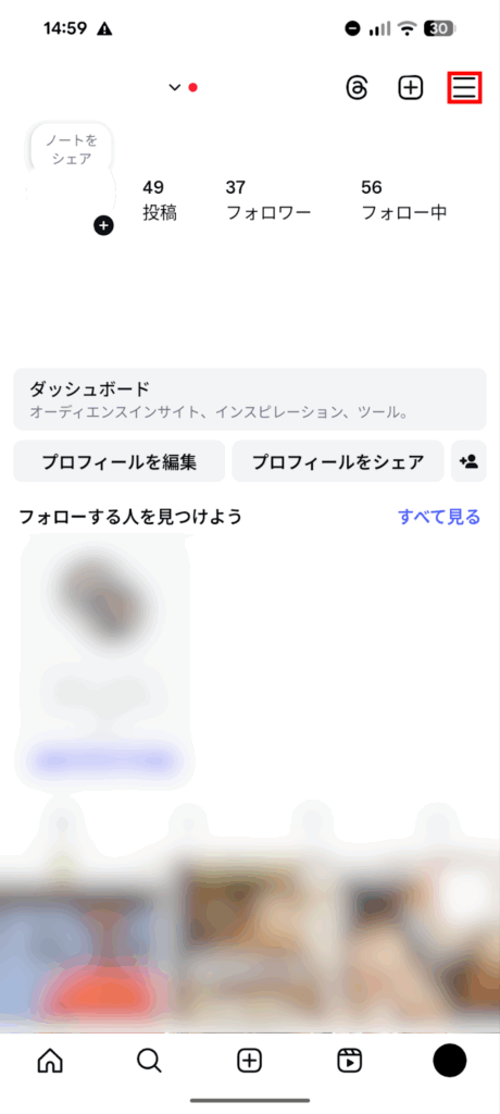 1.プロフィール画面右上のメニュー(三本線)をタップします。
