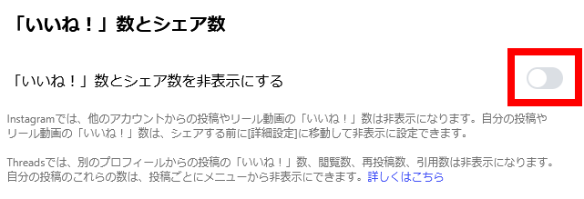 3.「いいね!数とシェア数を非表示にする」をオンにします。