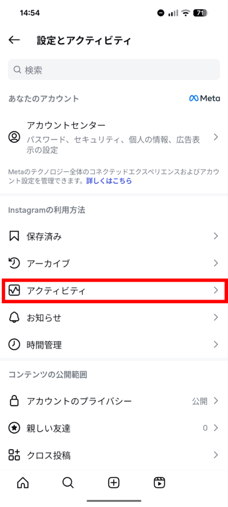 1.プロフィール画面右上のメニュー(三本線)から「設定とアクティビティ」を開きます。