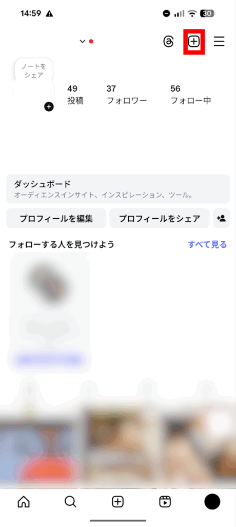 自分のプロフィール画面右上にある「+」ボタンをタップします。