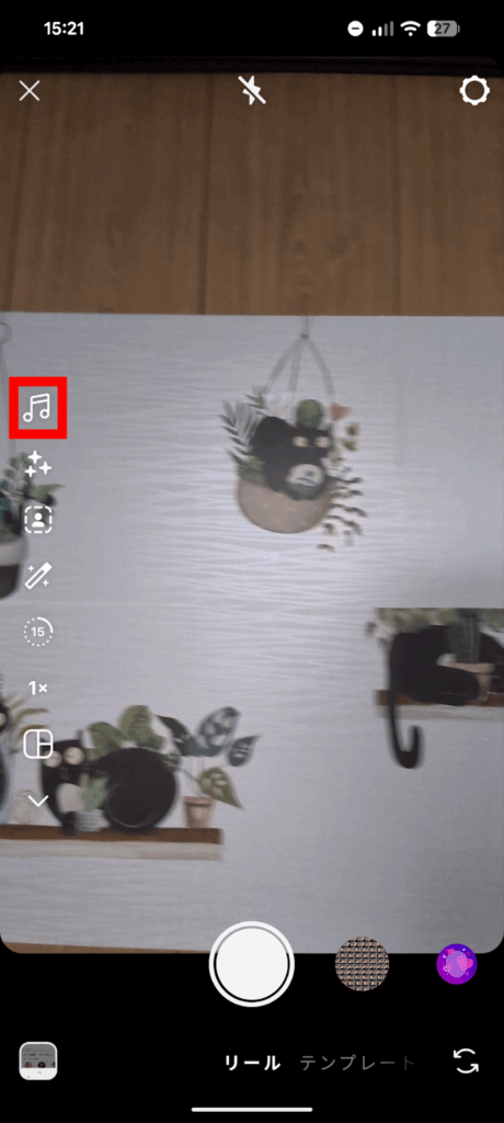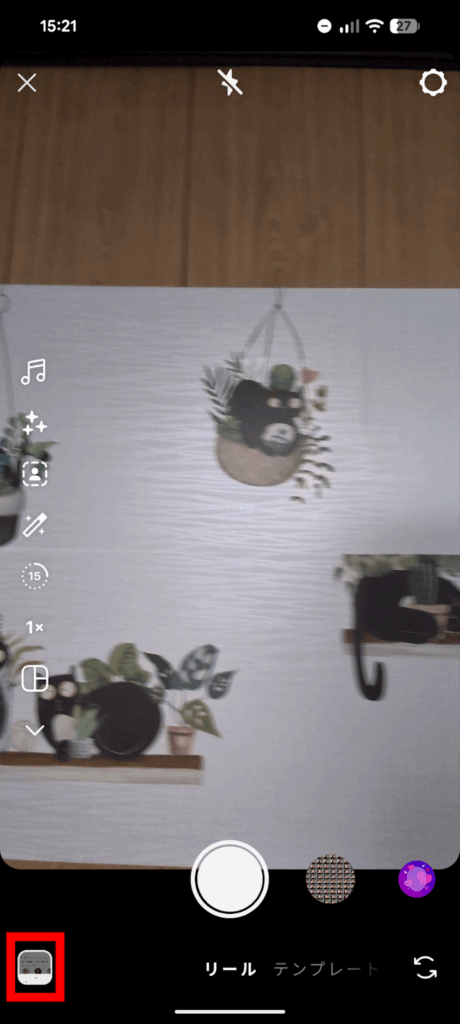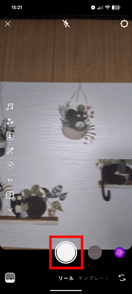 音源を設定したら、動画の素材を用意します。方法は2つあり、1つはリール作成画面の中央下にある撮影ボタンを押して、その場で新しい動画を撮影する方法です。