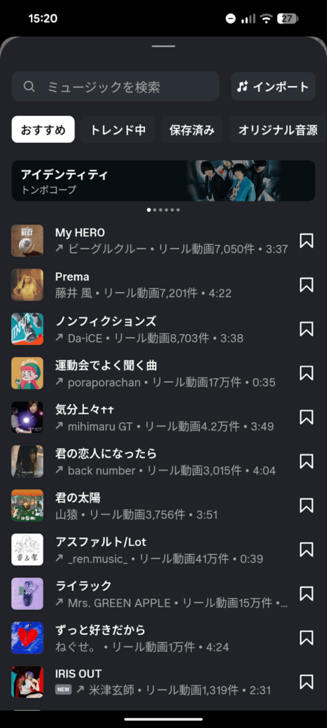 リールでは、その時々に流行している「トレンド音源」を使うと、再生数が伸びやすくなる傾向があります。