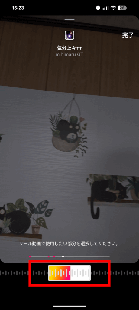 使用したい曲が見つかったら、曲名をタップし、動画で使いたい箇所をスライダーで選択してください。