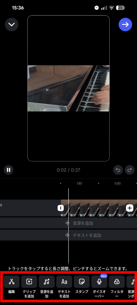 • カット編集: クリップの順番を入れ替えたり、不要な部分をカットしたりできます。