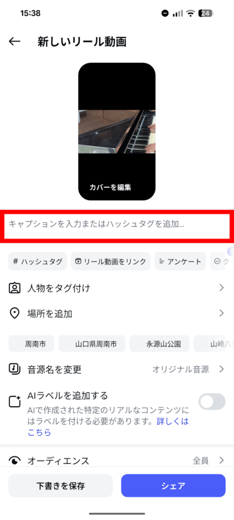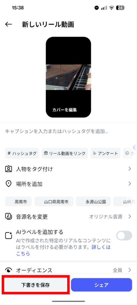 編集が終わった後、キャプション入力画面で「下書きとして保存」をタップすると、作成中のリールが保存されます。