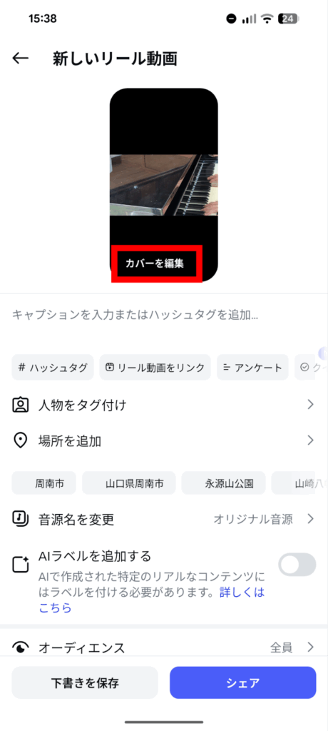 また、「カバーを編集」から、リールの一覧で表示される静止画(カバー画像)を設定できます。