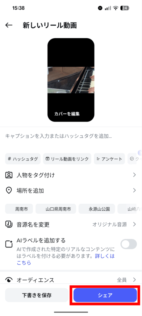 すべての設定が終わったら、画面下部の「シェア」ボタンをタップして投稿完了です。