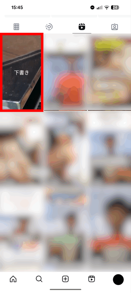 保存した下書きは、プロフィール画面のリールタブ内にある「下書き」フォルダからいつでも呼び出して編集を再開したり、投稿したりできます。