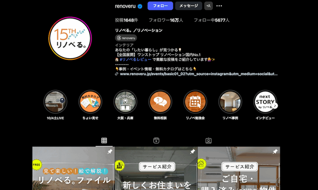 リノベる株式会社は、Instagramストーリーズを活用してリノベーション事例やイベント告知を発信しています。ショールームの様子や施工のビフォーアフターを映像で紹介し、フォロワーが「もっと詳しく知りたい」と思う流れでリールや自社サイトへ誘導する設計が特徴です。