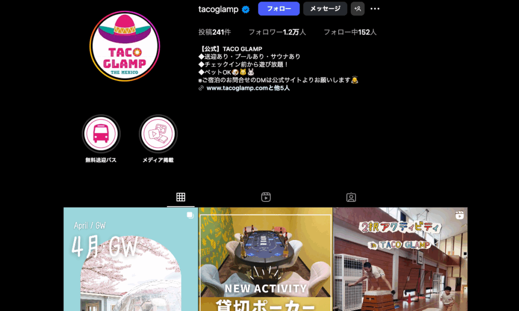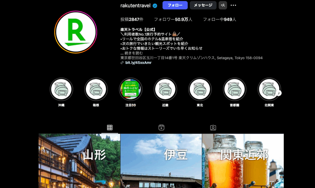 リールを活用した動画では、実際の宿泊シーンや観光スポットを映し出し、視覚的に旅行の魅力を伝えています。さらに、タイアップ投稿はプロフィール欄に「お得情報」として固定表示され、ユーザーがいつでも閲覧できる導線を確保しています。