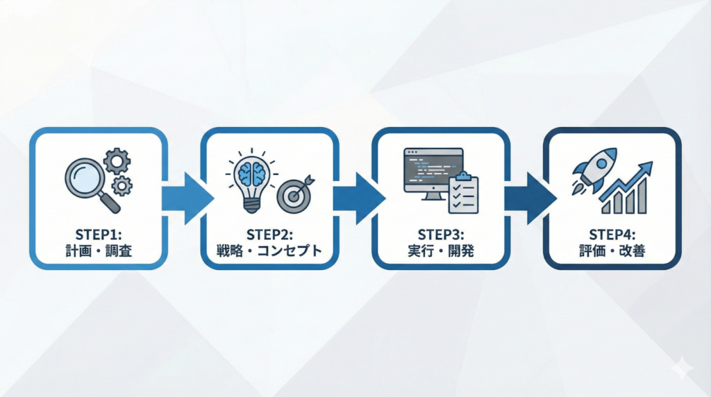 | [ステップ数]ステップのプロセスフロー図。STEP1から順番に矢印で接続。各ステップに[アイコンの種類]を配置。すべてのテキストは日本語で表示、各ステップに「STEP1」「STEP2」などのラベルを明記。クリーンなベクターアートスタイル。[〇:〇]のアスペクト比、ビジネス向け。シンプルで視認性の高いデザイン。企業プレゼンテーション・資料作成に最適。 |