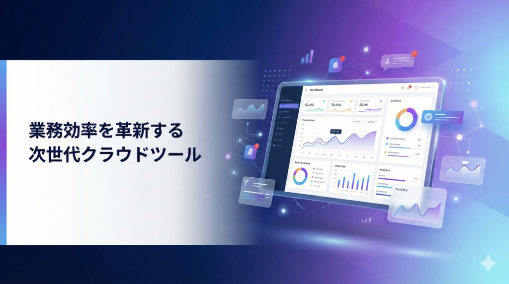 | モダンなSaaSプロダクトのヒーロー画像。中央に[プロダクト画面のモックアップ]を配置。背景は洗練されたグラデーション、ブルーからパープルまたはネイビーから明るいブルー。画面周辺に浮遊する抽象的なデータビジュアライゼーション要素、グラフ、チャート、通知アイコンを配置。左側または右側にテキストスペース「[キャッチコピー]」「[サブコピー]」を配置できる余白を確保。クリーンで未来的な印象。柔らかいシャドウとグロー効果。プロフェッショナルで信頼感のあるテクノロジー系デザイン。[〇:〇]のアスペクト比。高解像度、企業サイトLP向け。 |