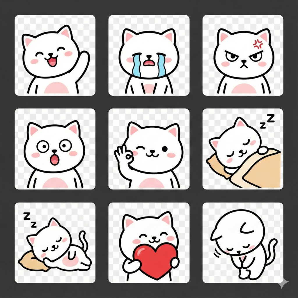 | LINEスタンプ風キャラクターイラスト[セット数]セット。キャラクターは[丸みを帯びた可愛い]デザイン、[キャラクターの種類]のキャラクター。[セット数]つの表情とポーズ:[表情・ポーズ1][表情・ポーズ2][表情・ポーズ3][表情・ポーズ4][表情・ポーズ5][表情・ポーズ6][表情・ポーズ7][表情・ポーズ8]。各イラストは正方形フレーム内に配置。シンプルな線画スタイル、太めの輪郭線。背景は透明感のある白または淡い色。[配色の雰囲気]な配色。日常会話で使いやすいシーン。[〇:〇]のアスペクト比。LINEスタンプ、SNSリアクション用。 |