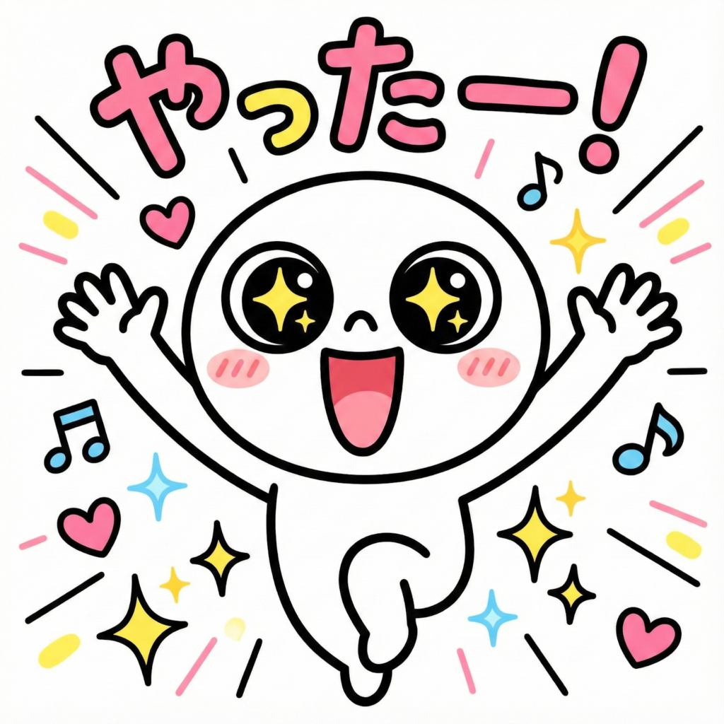 | 感情表現に特化したLINEスタンプ風イラスト。キャラクターは[キャラクターの特徴]、大きな目と表情豊かな口。感情:[感情の種類と動作]を表現。太めの黒い輪郭線。デフォルメされた[頭身の設定]。背景に[背景エフェクトの種類]を配置。[配色の雰囲気]な配色、[アクセントカラー]のアクセントカラー。テキストスペース「[テキスト内容]」を上部または下部に配置。[イラストのタッチ]。[〇:〇]のアスペクト比。LINEスタンプ、メッセージアプリ用。 |