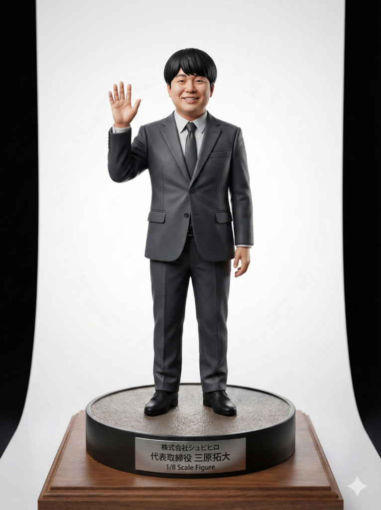 | リアルなスケールフィギュア風3Dレンダリング。[キャラクターまたは人物の特徴]を精密に再現したフィギュア。[ポーズ]。台座付きで展示用ディスプレイスタンドの上に配置。細部まで作り込まれた質感、マットな塗装仕上げ。適度な陰影とハイライトで立体感を強調。背景は[背景スタイル]、スタジオ撮影風のライティング。フィギュアのスケール感は1/8または1/7程度。プロフェッショナルな商品写真のような仕上がり。高品質なコレクターズアイテムの雰囲気。[〇:〇]のアスペクト比。 |