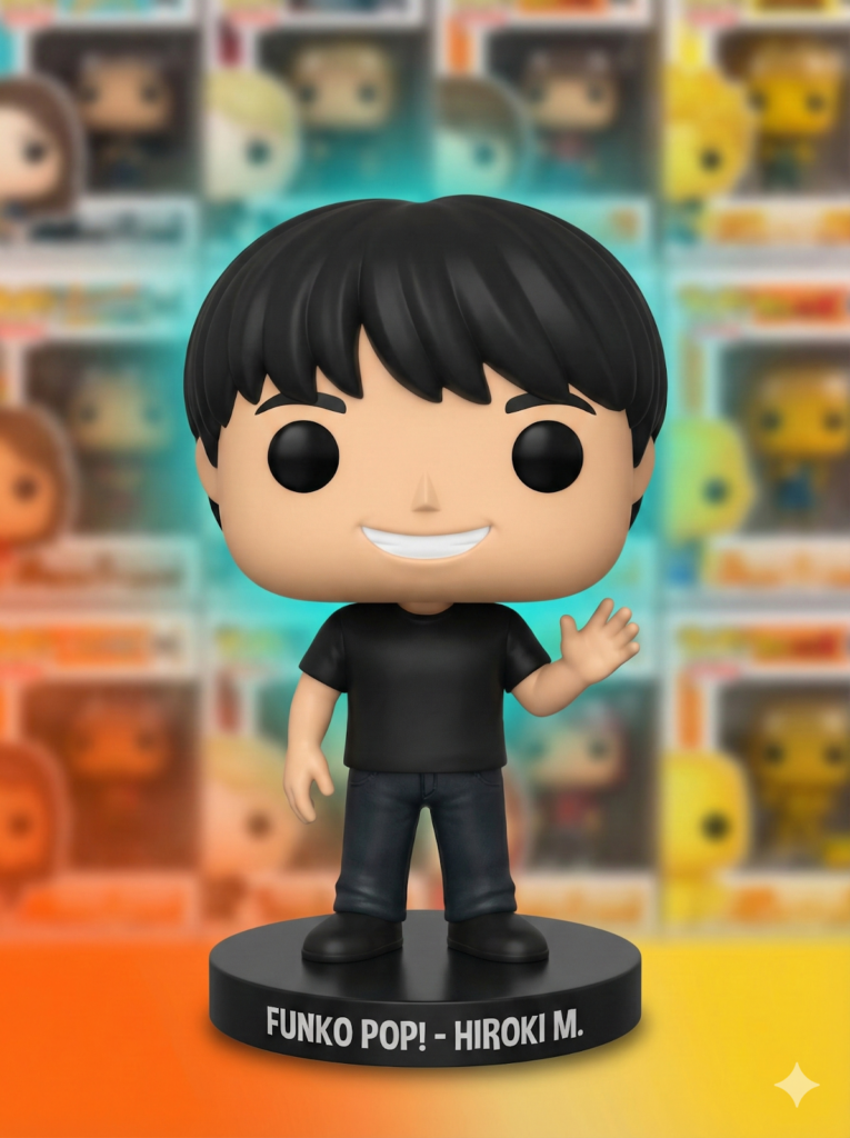 | Funko Pop風デフォルメフィギュアスタイル。[キャラクターまたは人物の特徴]を持つキャラクター。特大の四角い頭部、小さな丸い黒目、鼻なし、極端に小さい体(2頭身)、短い手足。[服装や特徴的なアイテム]を身につけている。[ポーズ]。台座に立っている状態。ビニール製フィギュアのような質感、マットな塗装仕上げ。シンプルでポップな配色。背景は[背景スタイル]、コレクション棚風。可愛くデフォルメされたスタイル、Funko Pop公式フィギュアのような見た目。[〇:〇]のアスペクト比。 |