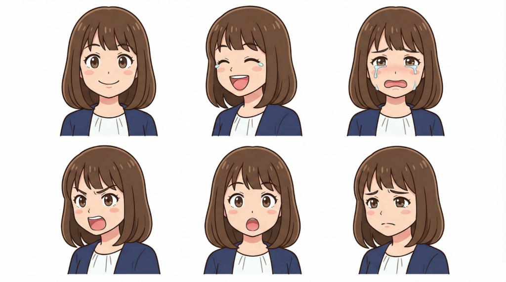 | キャラクター固定型表情集。以下のキャラクター設定を厳密に維持:[キャラクターの詳細な外見設定]。[表情の種類数]種類の表情バリエーション:[表情1][表情2][表情3][表情4][表情5][表情6]。各表情で顔の角度は正面または斜め、バストアップ構図。髪型、顔の輪郭、目の形、服装などキャラクター要素は完全一致。表情のみが変化。[イラストスタイル]のイラストスタイル。背景は[背景スタイル]、シンプルで統一。キャラクターシート風のレイアウト。[〇:〇]のアスペクト比。キャラクターデザイン資料、表情集、漫画・アニメ制作用。 |