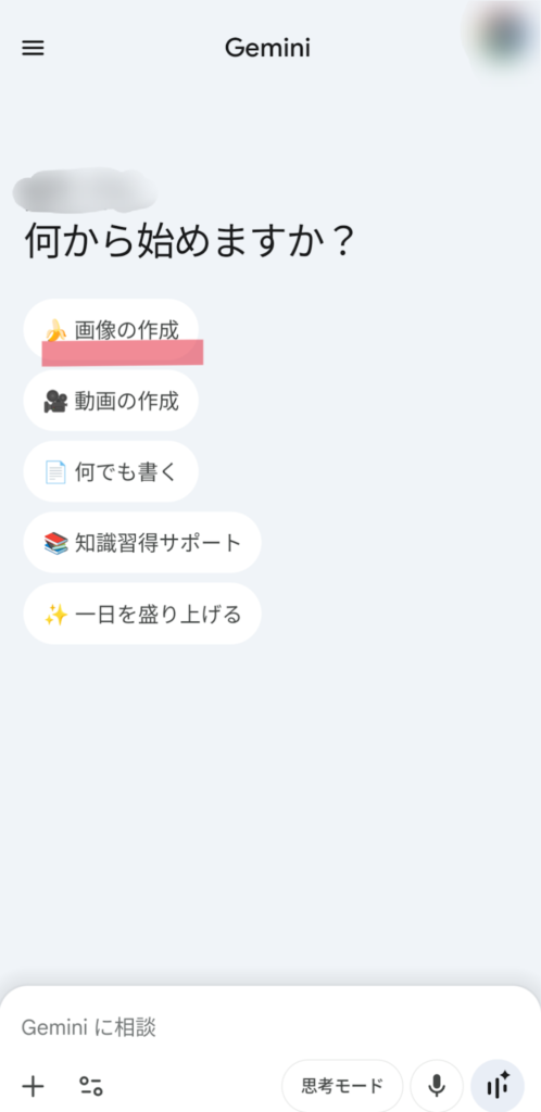 GoogleのGeminiアプリを開くと、「何から始めますか?」というメッセージの下にいくつかのメニューが並んでいます。