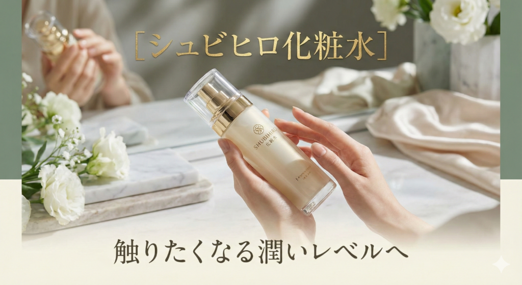 | 高級感のある商品広告バナー。中央に商品を配置するスペースを確保。商品に手を添える人物の手元のみを配置し、使用シーンを演出。上部に「[商品名]」、下部に「[キャッチコピー]」のテキストエリア。柔らかく洗練された背景。商品を引き立てる光と影の効果。エレガントな装飾要素を控えめに配置。ライフスタイル感を感じさせる自然な雰囲気。清潔感と高品質を表現。バランスの取れた構図。 |