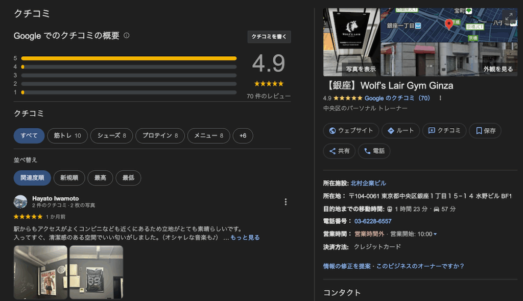 成功のポイントは、Googleビジネスプロフィールの最適化と口コミ運用の徹底です。店舗名・住所・営業時間・カテゴリを正確に登録し、写真やトレーニング風景を定期的に投稿しているのが特徴です。また、口コミへの丁寧な返信を通して信頼性の獲得にも力を入れています。
