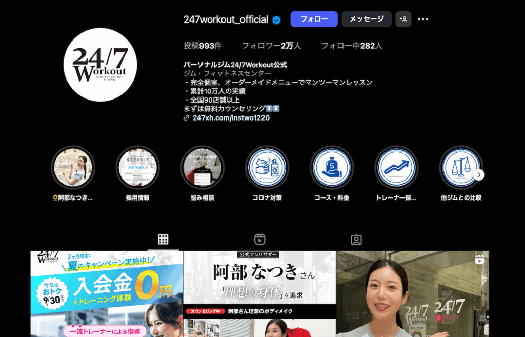 また、YouTubeと連携した動画投稿や、ハイライトで「料金・コース・他社比較」を整理する導線設計にも工夫がみられます。役立つ情報発信+わかりやすい導線により、SNSから体験予約・入会へと自然に誘導できている好例といえるでしょう。