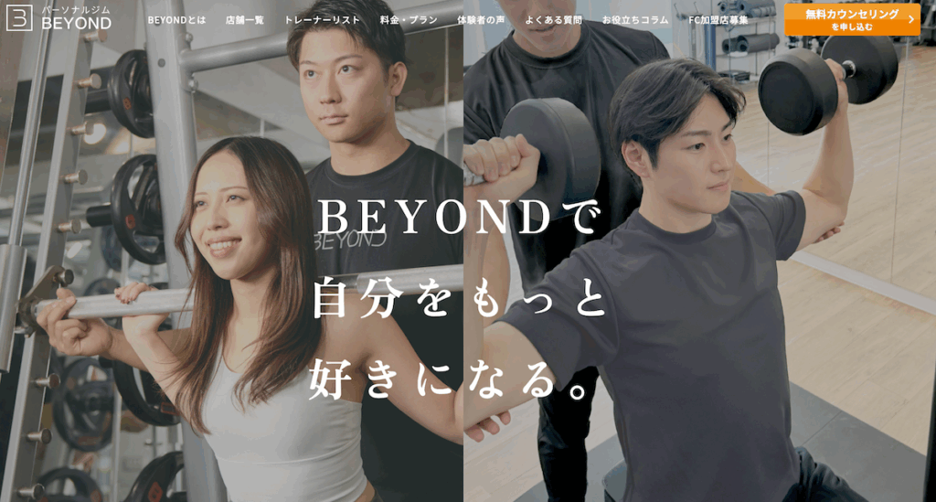 BEYONDは、採用倍率70倍を突破した、実績のあるトレーナーのみを採用し、全国163店舗を展開する大手パーソナルジムです。累計3万人以上のボディメイクを成功させ、「質の高い指導×継続できる環境」で幅広い層から支持を得ています。