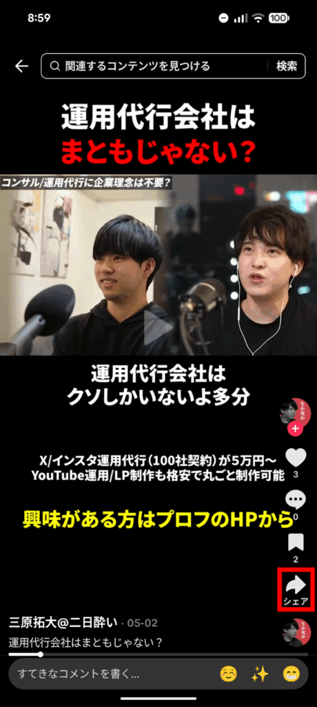 取り消したい動画を表示し、画面右側の「シェア」アイコンをもう一度タップします。