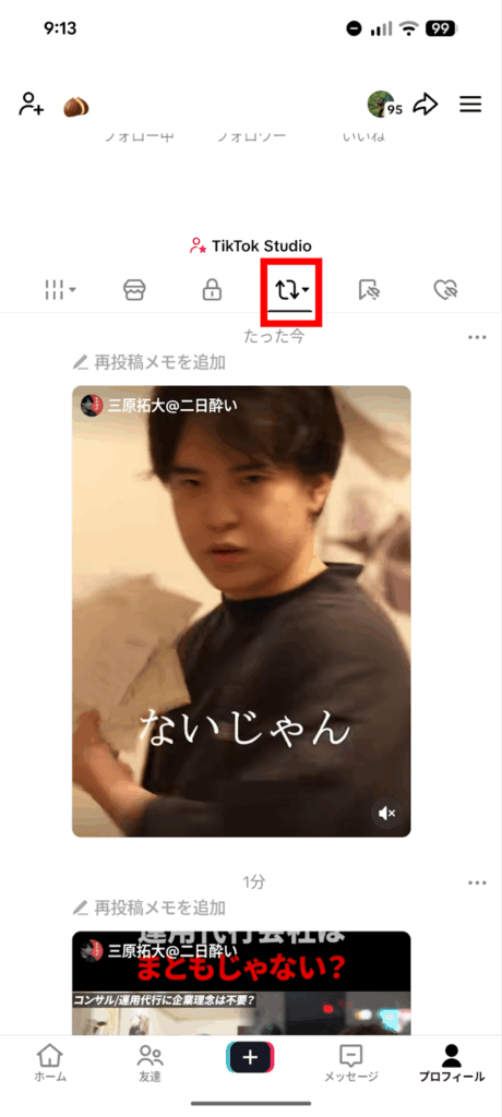 動画投稿一覧の上部にある、円形の矢印が描かれたアイコン(再投稿タブ)をタップします。