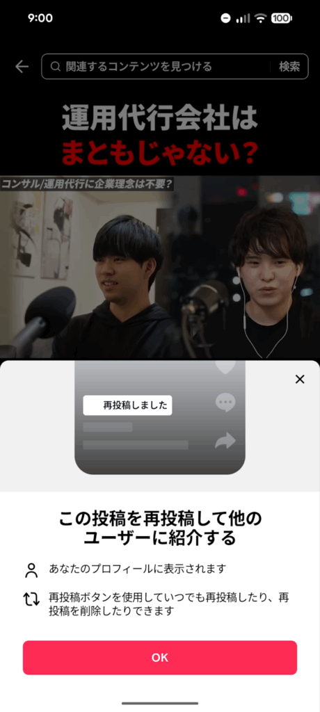 自分が過去にどの動画を再投稿したかを確認したい場合、プロフィールページから簡単に見返すことができます。自社がどのようなコンテンツに共感を示してきたかを振り返る際に便利です。