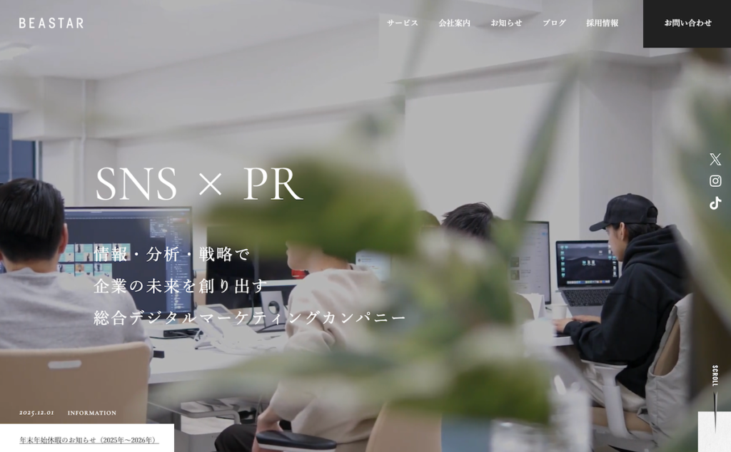 BEASTAR株式会社は、幅広い業種のX(旧Twitter)アカウントを支援してきた運用代行会社です。これまでに100アカウント以上の運用実績があり、実際に活動しているインフルエンサーがコンサルティングを担当する点が特徴です。