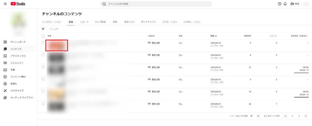 動画が検索結果に表示されるためには、公開設定が「公開」になっている必要があります。YouTube Studioにログインし、左メニューの「コンテンツ」をクリックすると、投稿済み動画の一覧が表示されます。